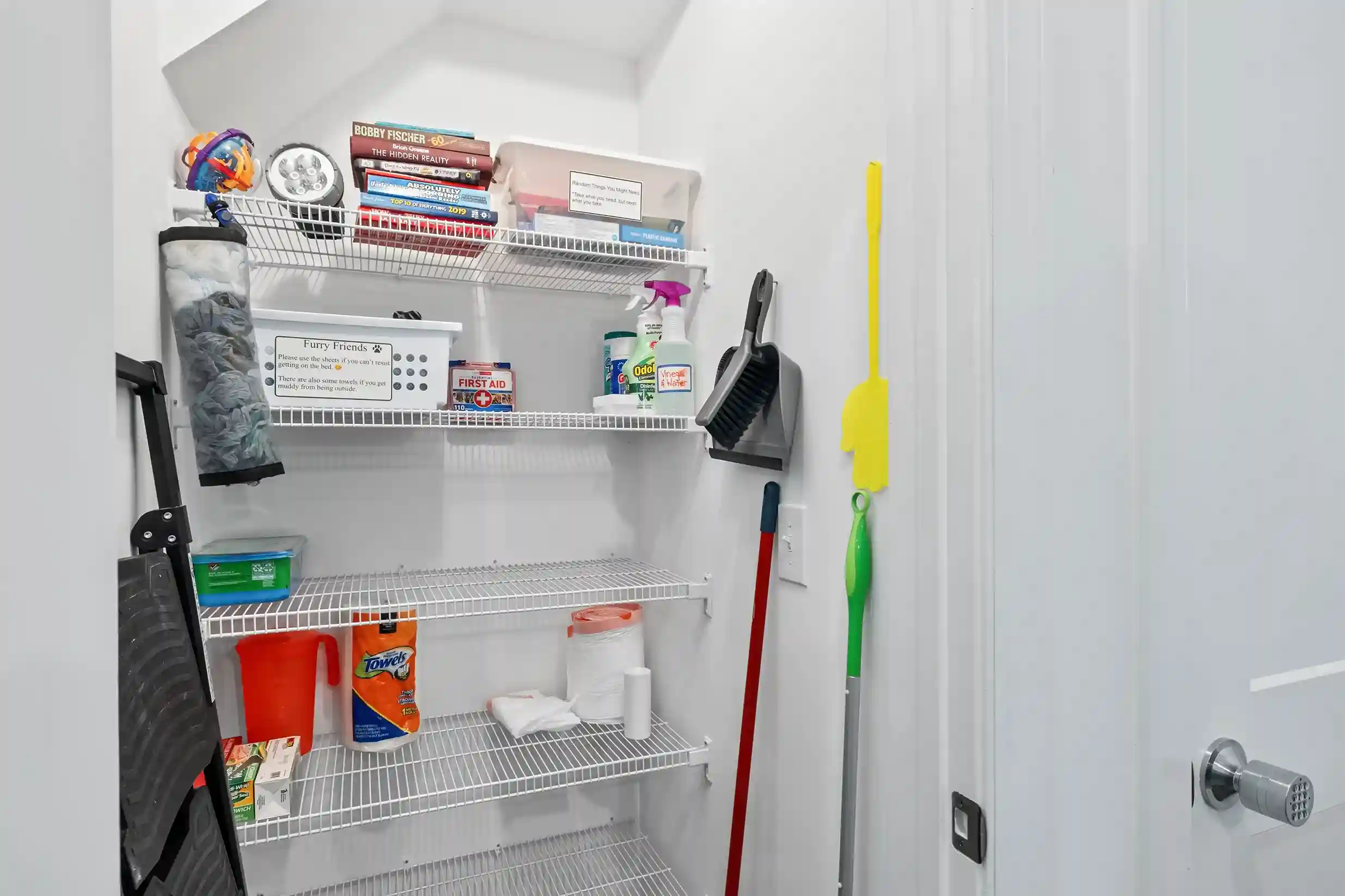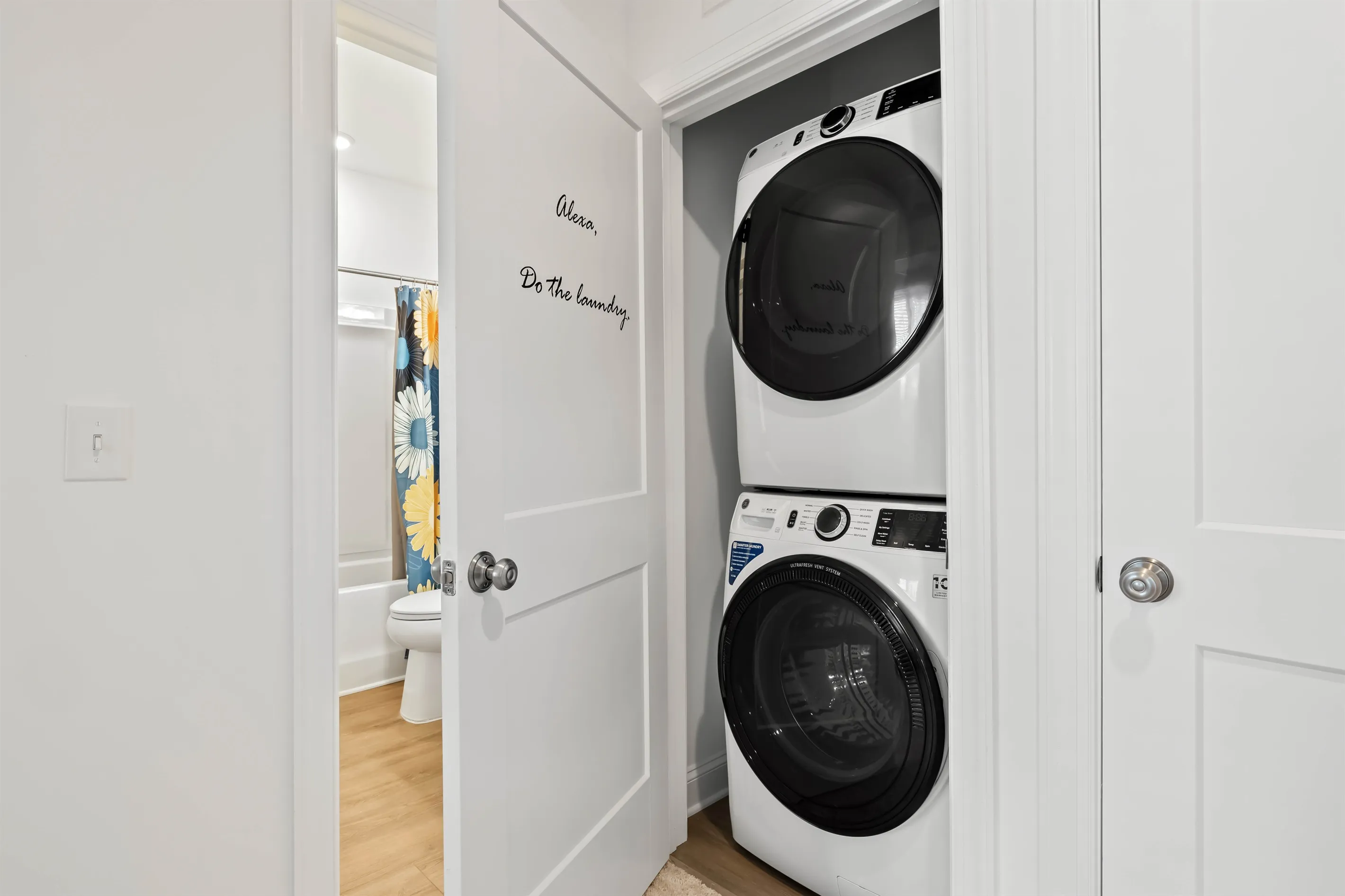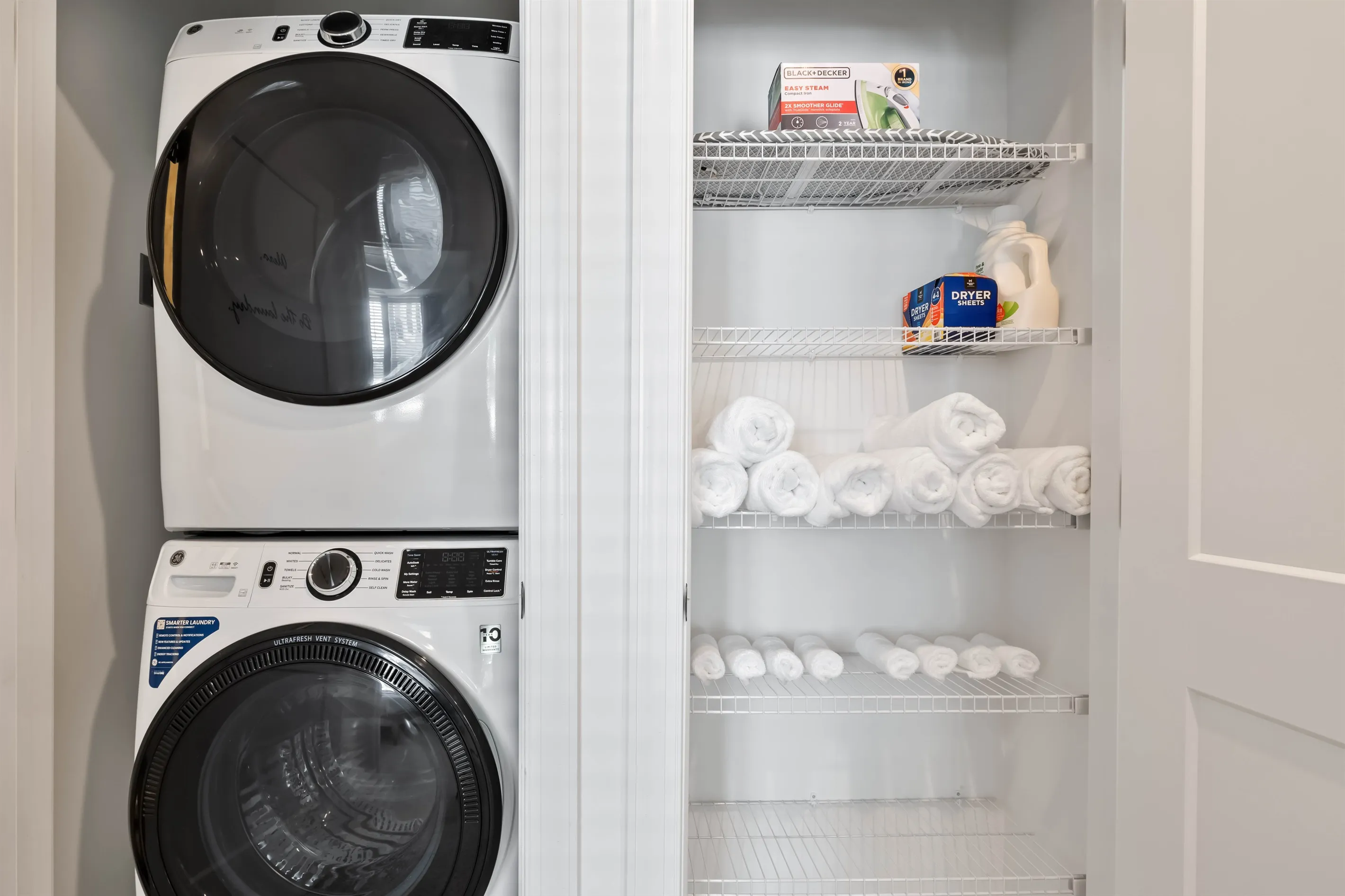 A laundry closet is located outside of the guest bathroom so that you can easily keep your clothes fresh during your stay.