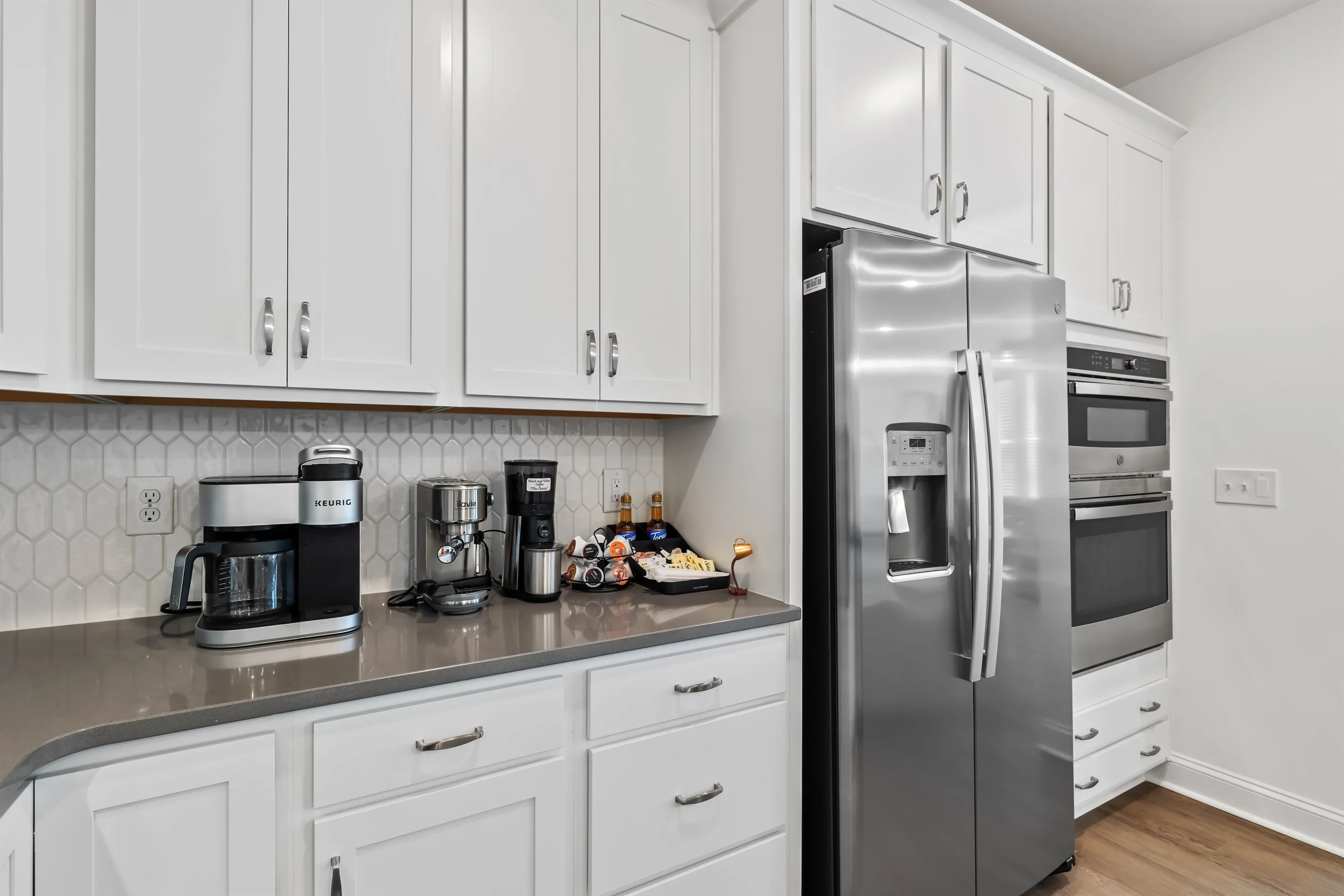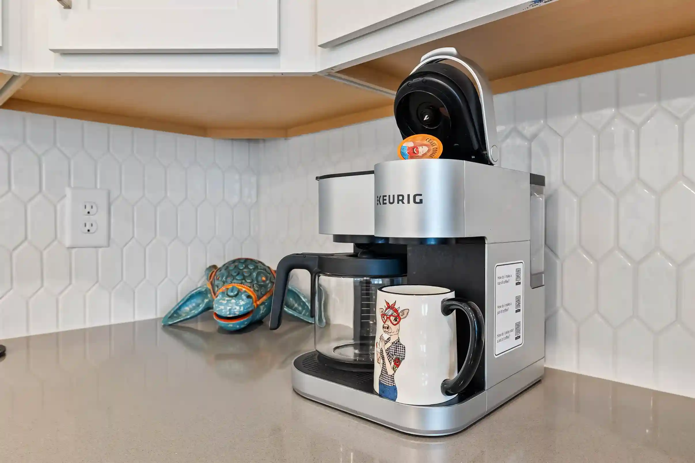 Prepare to be amazed at what all this coffee bar offers! There are a variety of brewing options to satisfy every coffee lover's taste buds. There is a Keurig Duo, which offers a 12c pot or single-serve convenience, an espresso machine with frother, and a bean grinder. The bean grinder will be full of fresh beans from Black and White Coffee Company, a coffee shop just down the road. If you prefer a quick cup, there is a selection of K-cups. You can doctor it up with a selection of syrups, sugar/Splenda and creamers.
