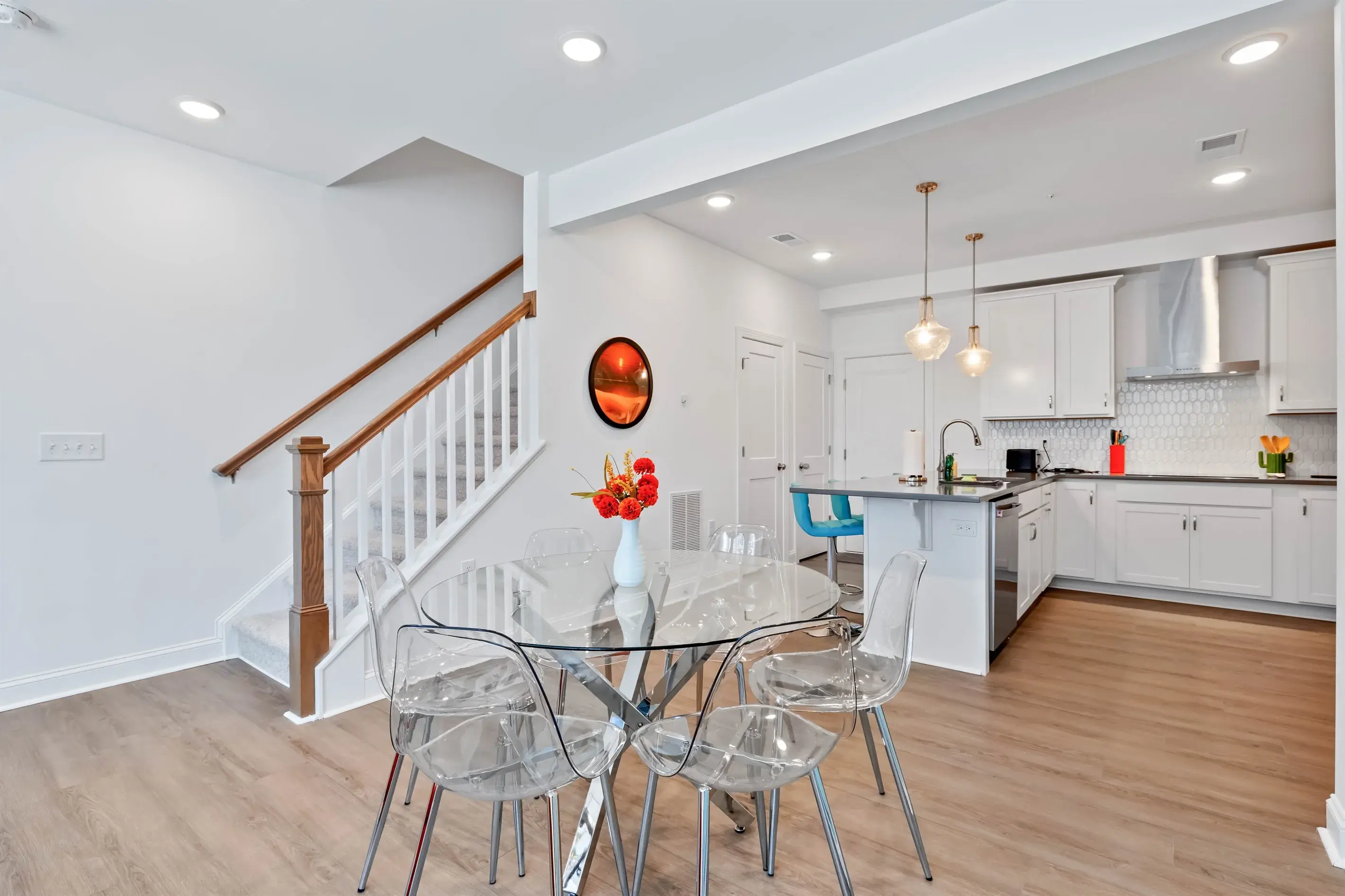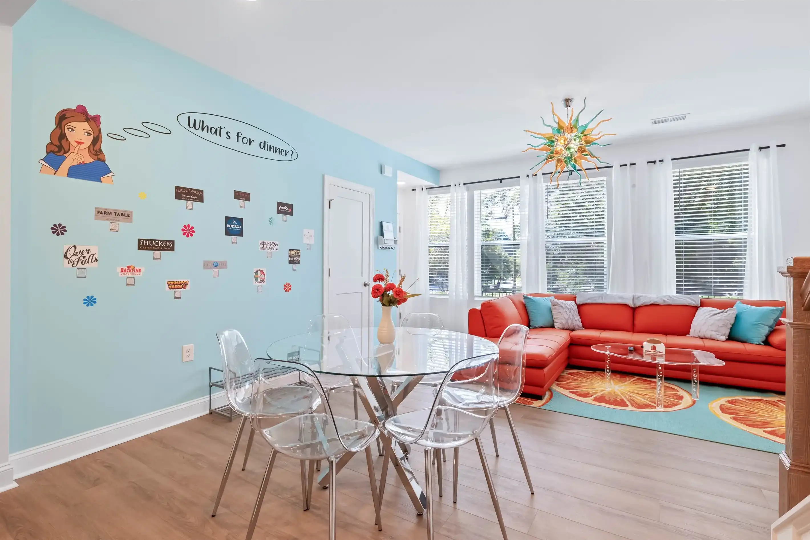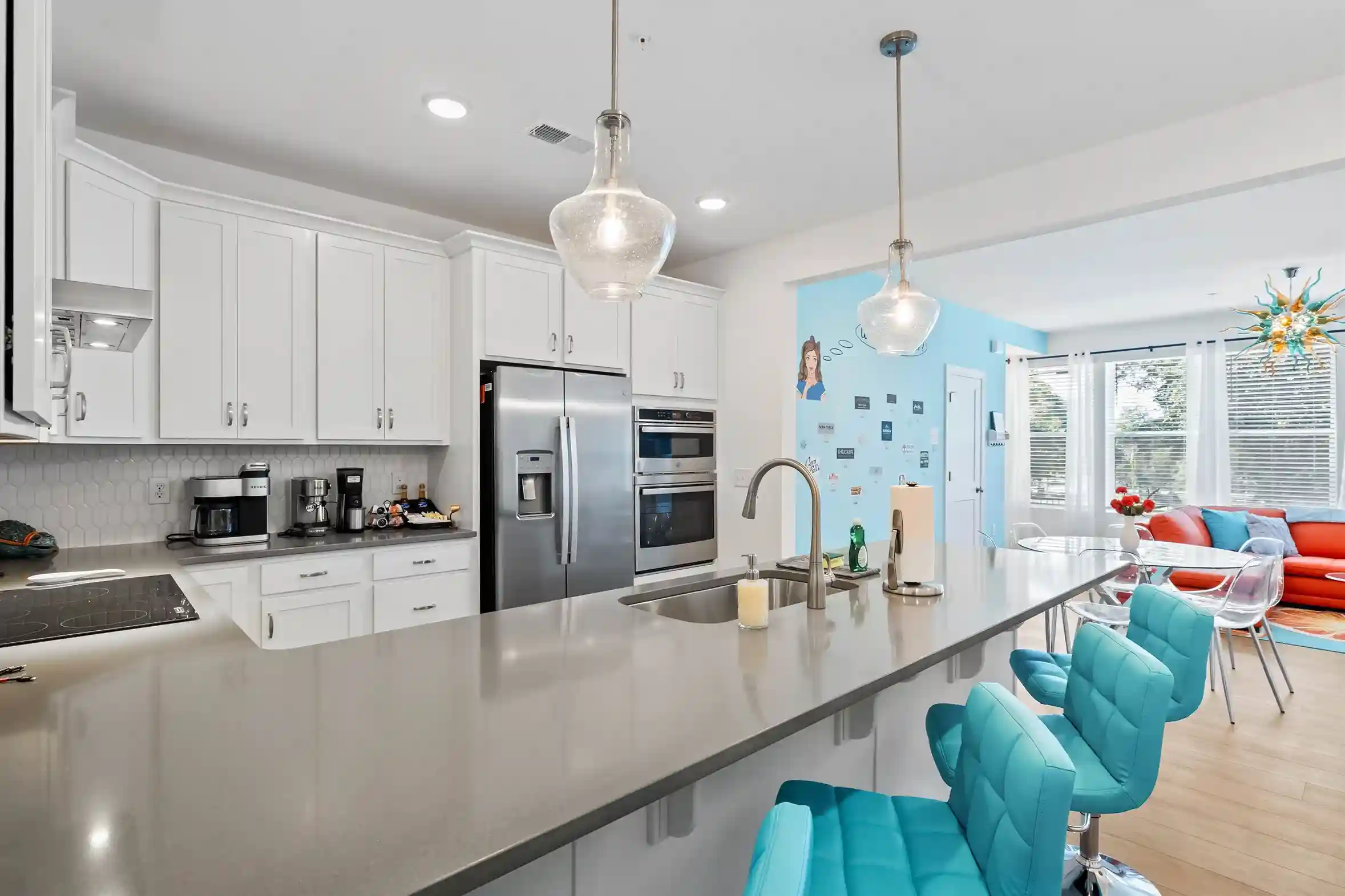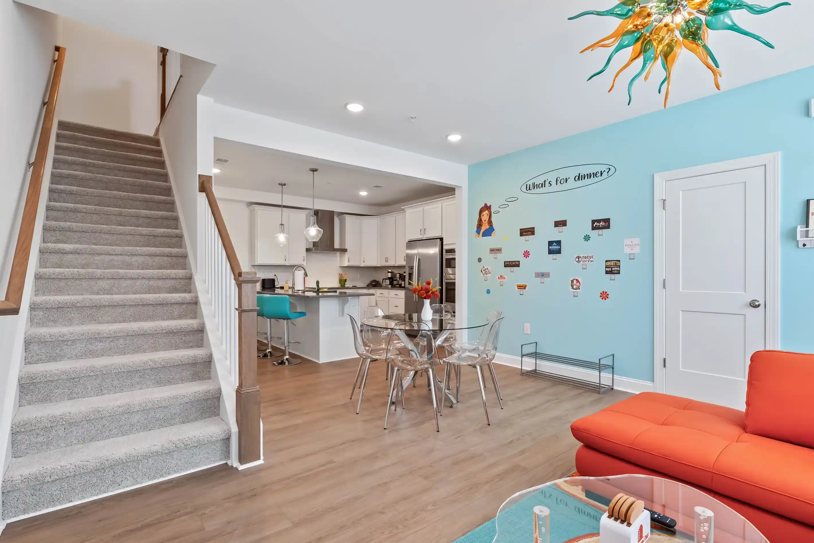 This open concept layout has the dining area between the kitchen and the living room. The living area is comfortably decorated a leather sectional, complete with pillows and blankets to snuggle up with. Sit back and watch a show on the 65" Smart TV or plan your next day in Wake Forest using high-speed WiFi. You’ll find a selection of games and books in the pantry in case you want some family entertainment for a rainy day or evening.
