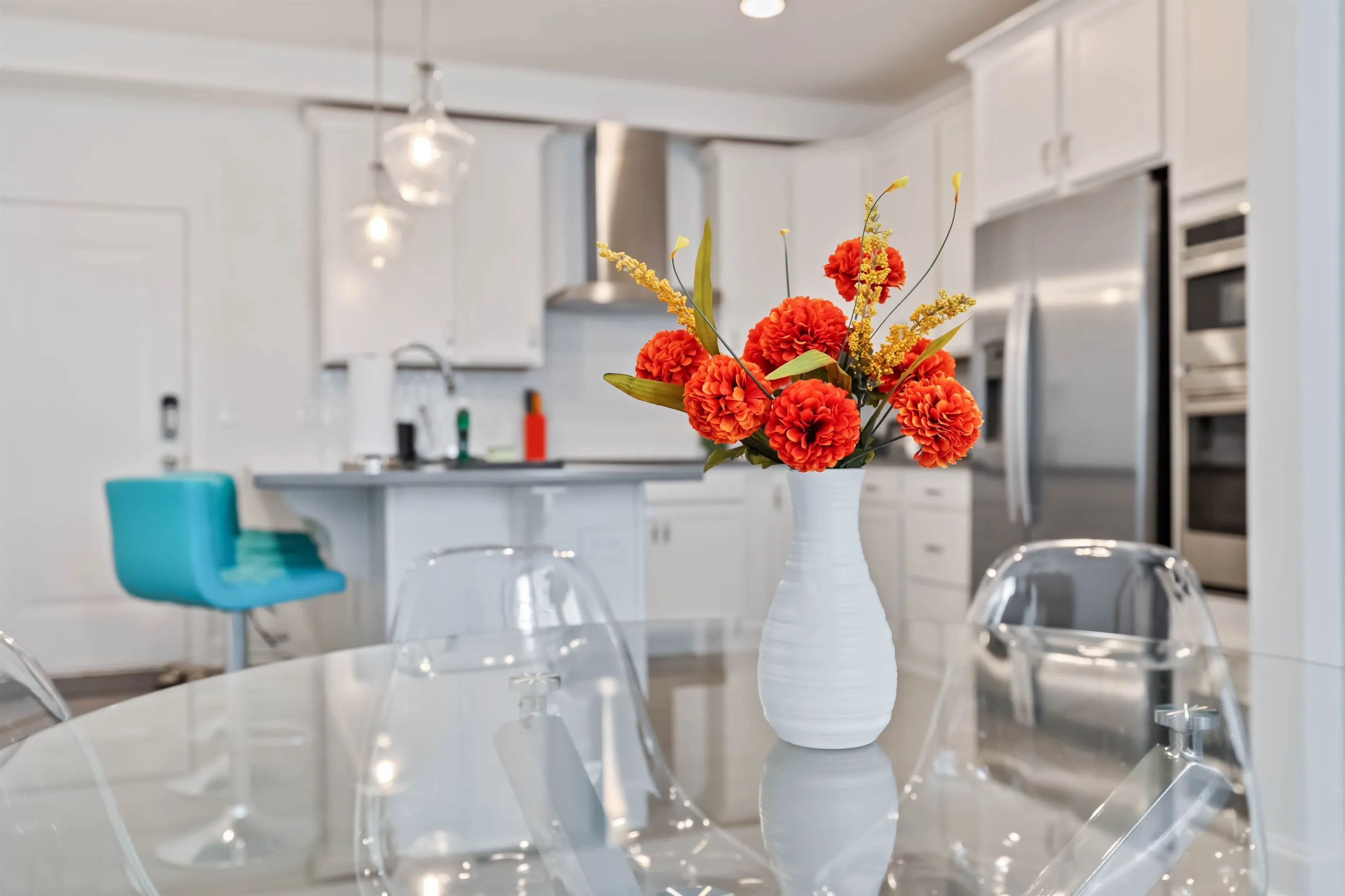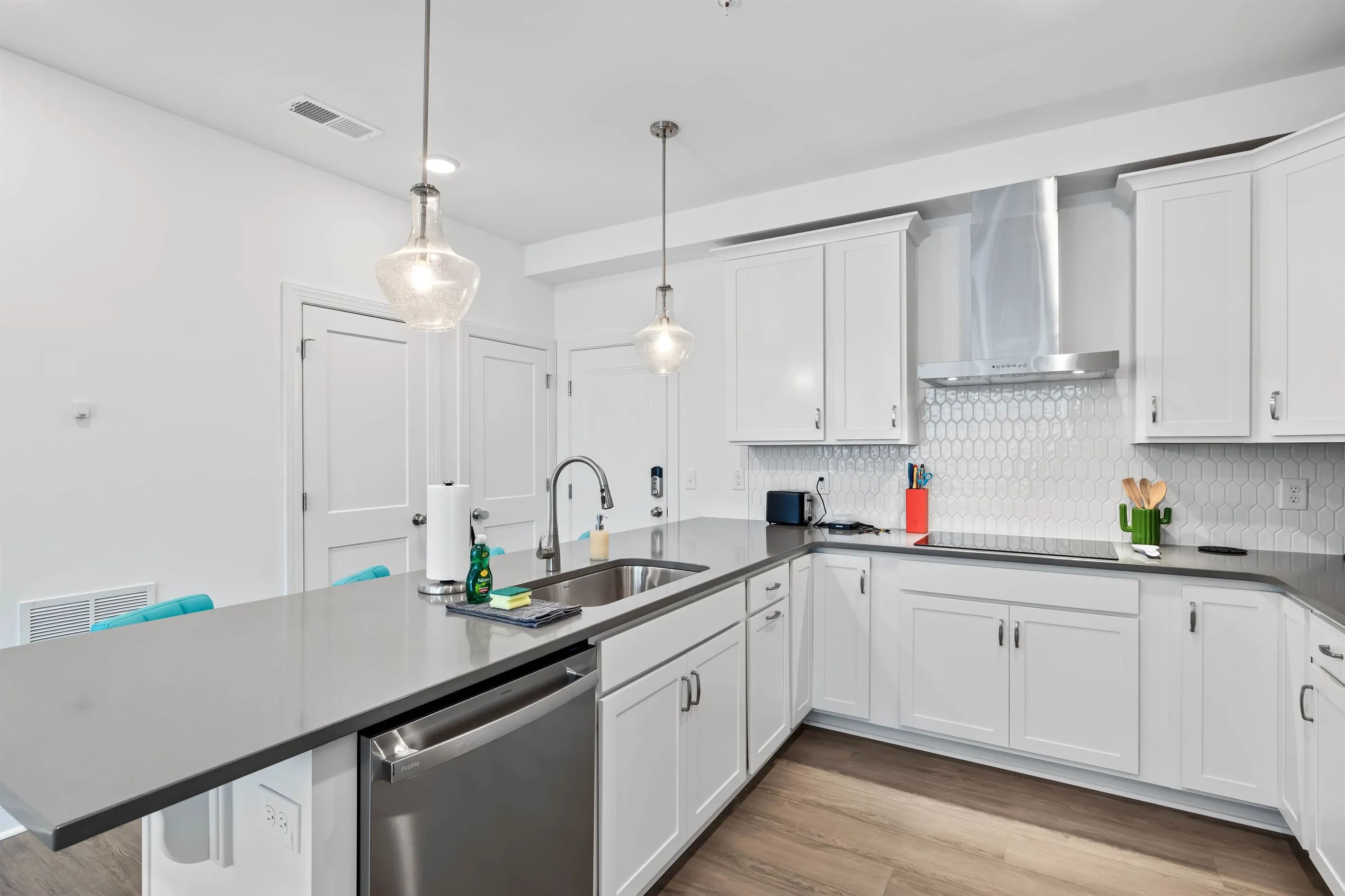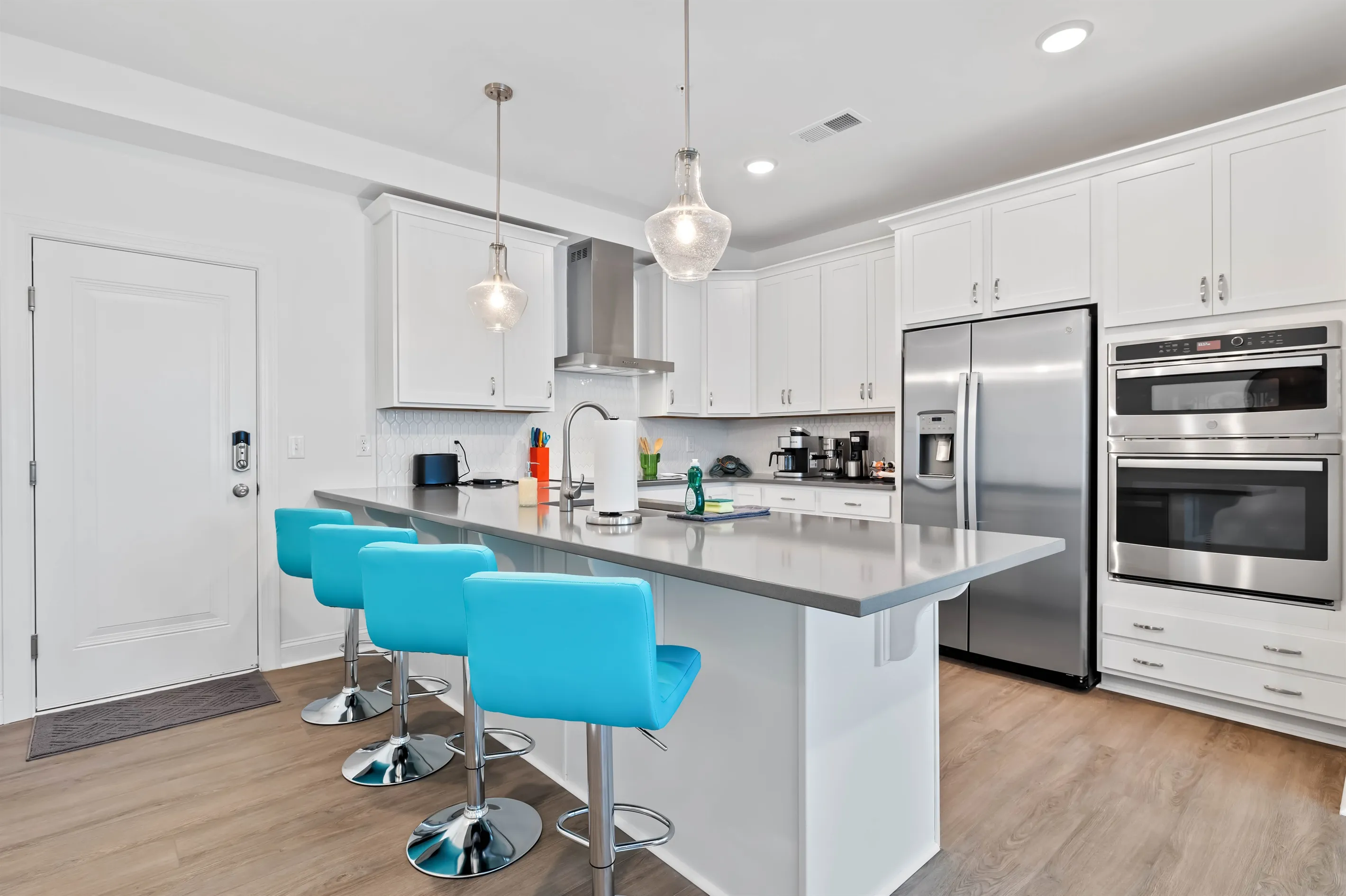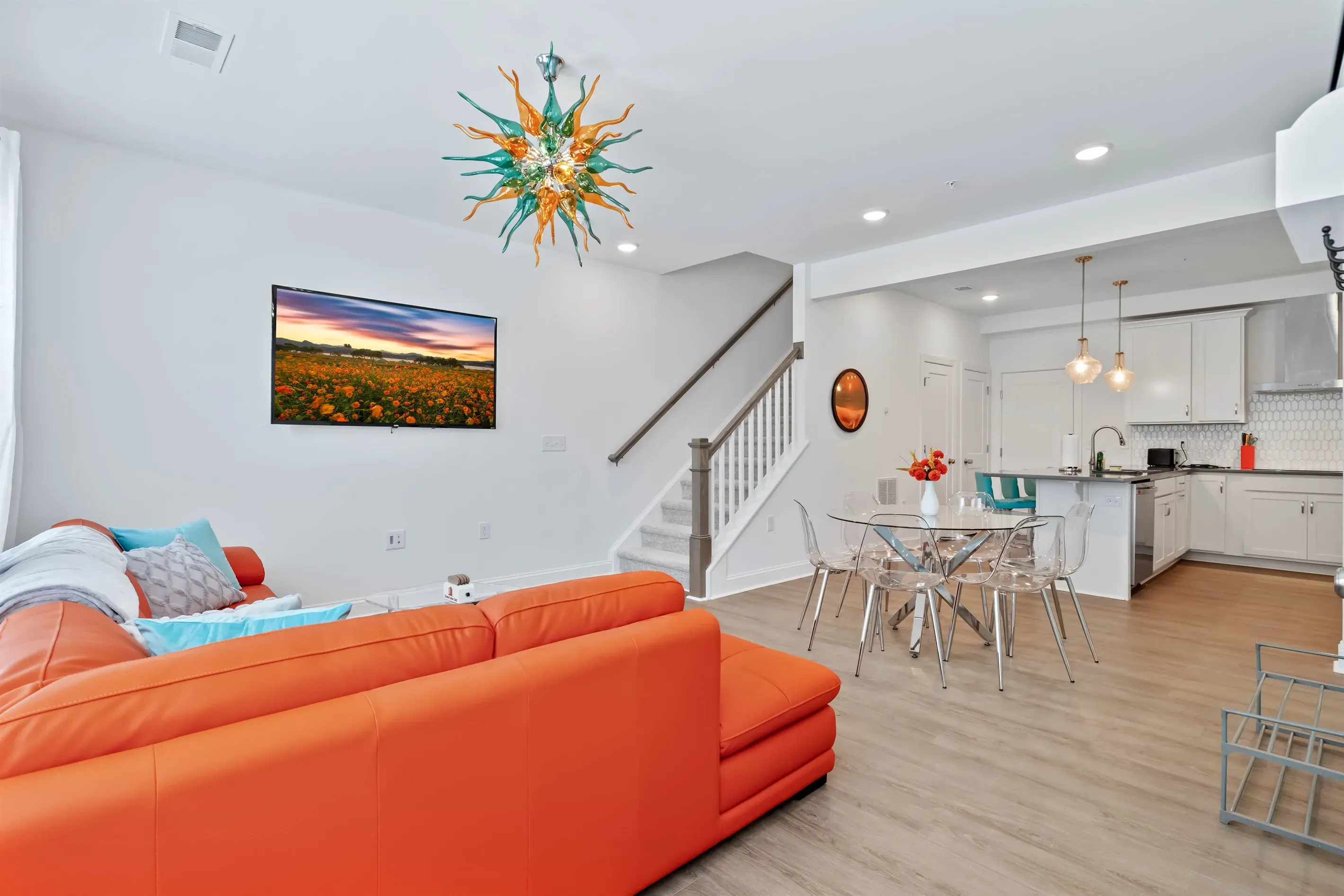 This open concept layout has the dining area between the kitchen and the living room. The living area is comfortably decorated a leather sectional, complete with pillows and blankets to snuggle up with. Sit back and watch a show on the 65" Smart TV or plan your next day in Wake Forest using high-speed WiFi. You’ll find a selection of games and books in the pantry in case you want some family entertainment for a rainy day or evening.