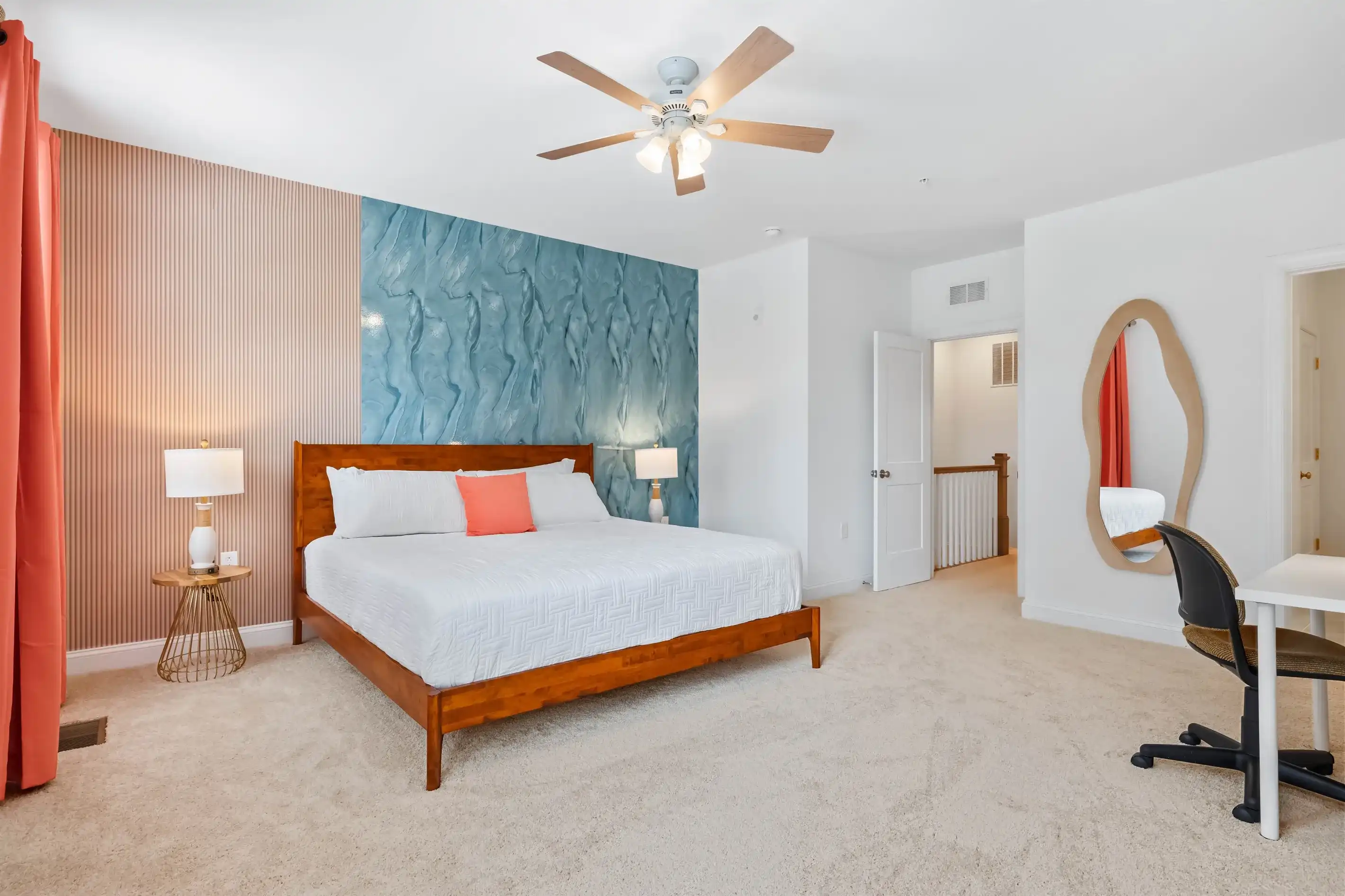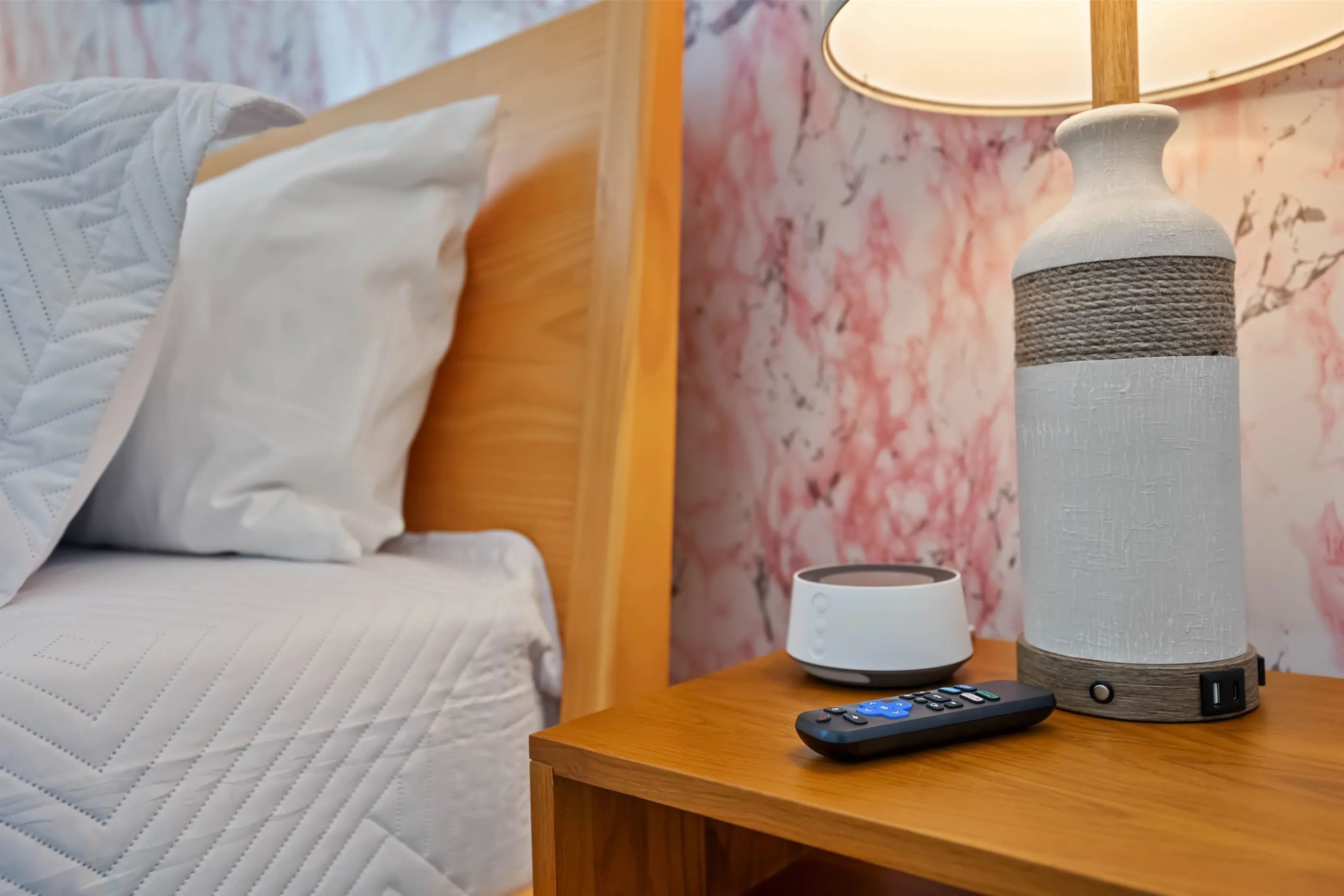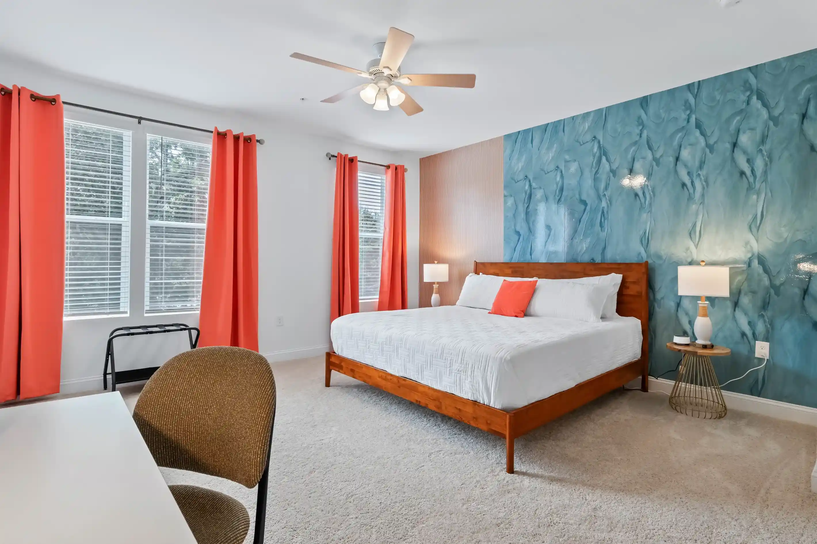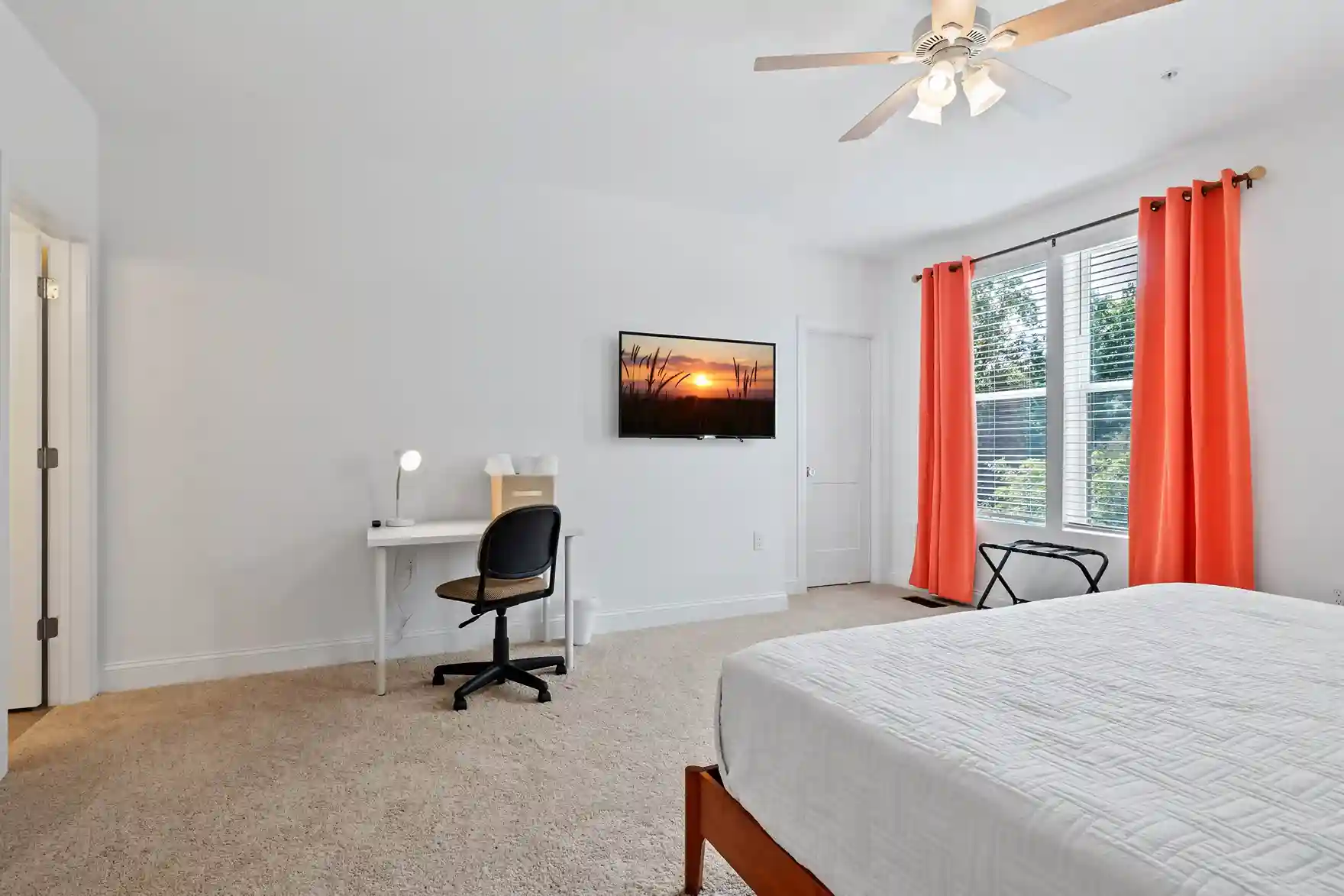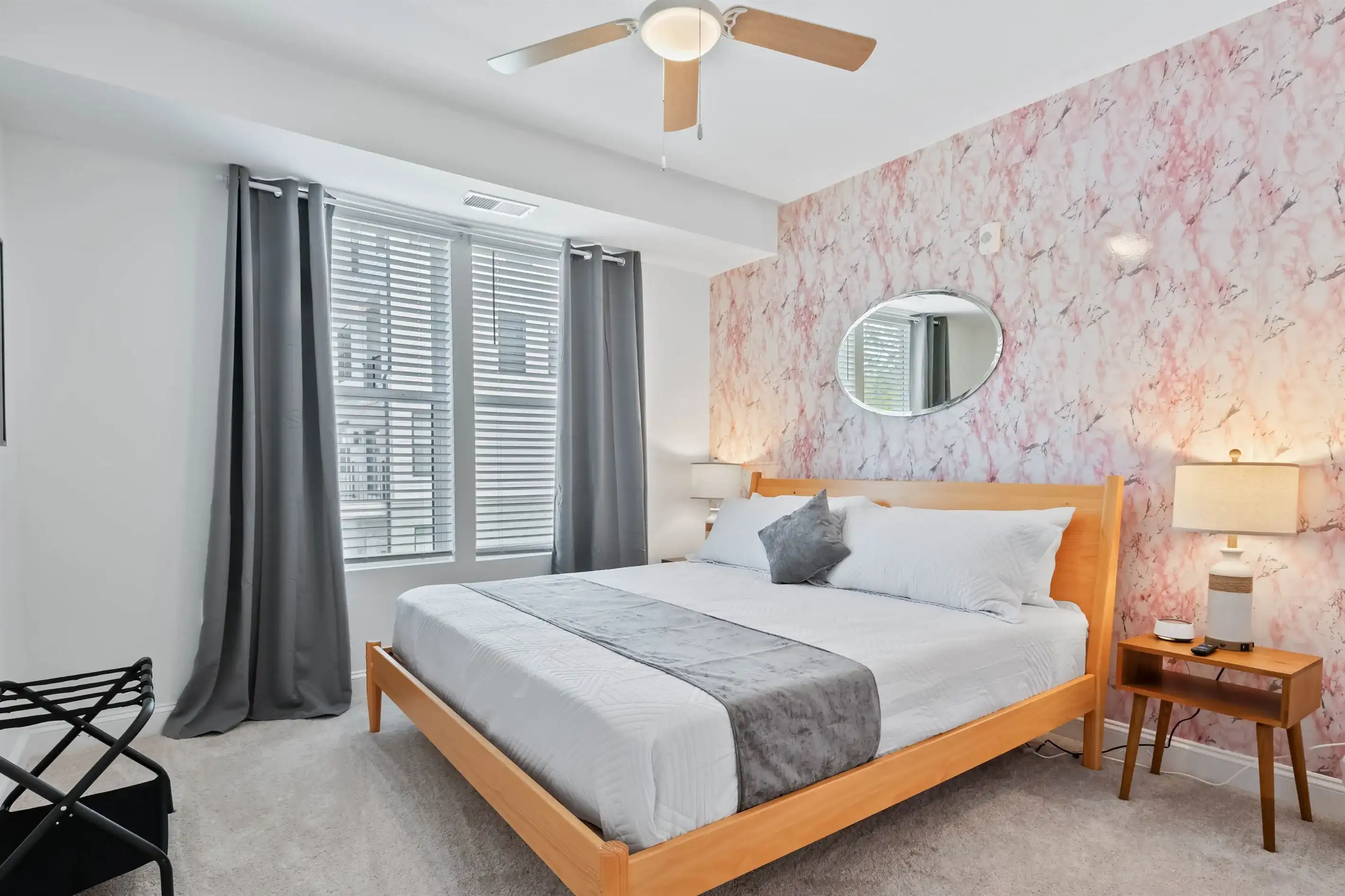 From comfy king sized beds to blackout curtains to sound machines, each bedroom was designed to ensure a great night's sleep. When unwinding before bed, log in to your favorite apps on the wall-mounted Smart TV. Each bedroom also provides 2 nightstands, lamps with USB ports for added convenience, a luggage rack, along with a closet to stow away your belongings.